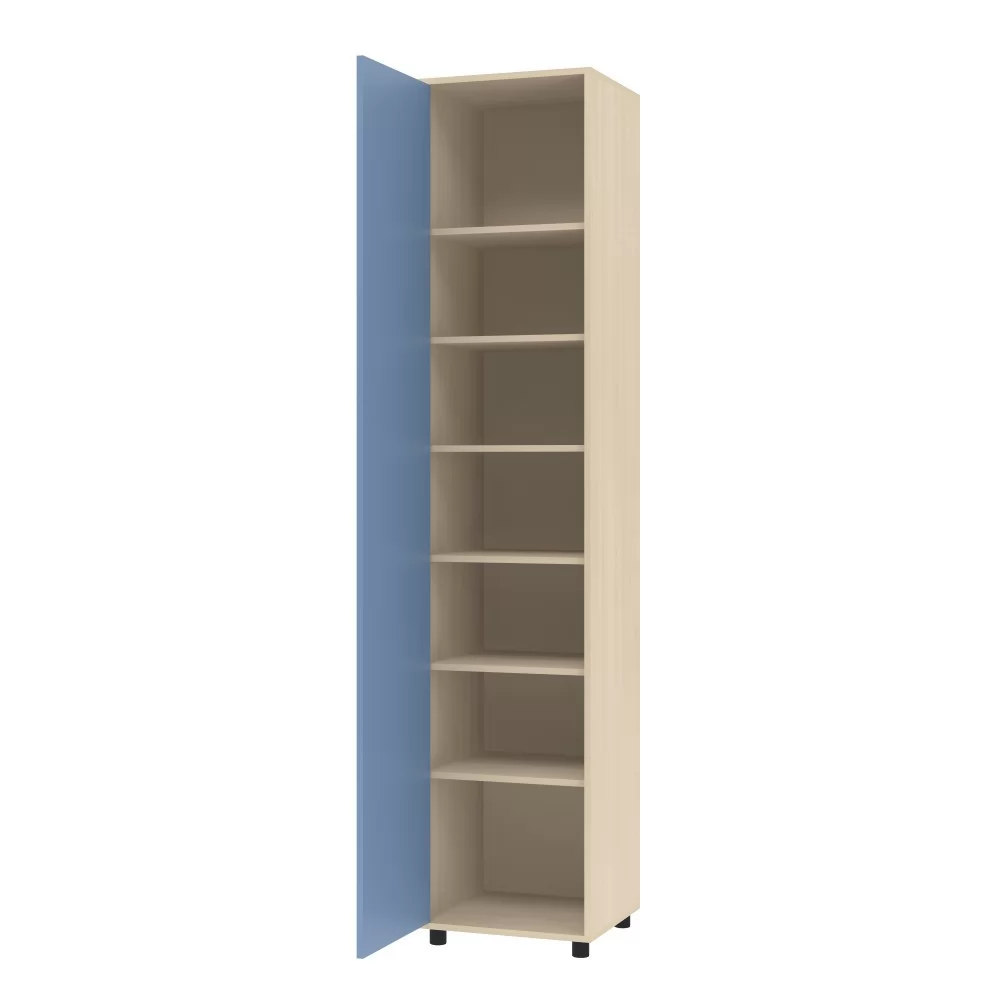 Шкаф однодверный представляет собой красивый и функциональный пенал для хранения личных вещей. Внутри шкафа расположен вертикальный ряд из шести полок. Компактное и удобное, это изделие отлично впишется в уютный интерьер детской комнаты. Шкаф можно собрать с открыванием двери как на правую сторону, так и на левую. Шкаф установлен на регулируемых опорах.