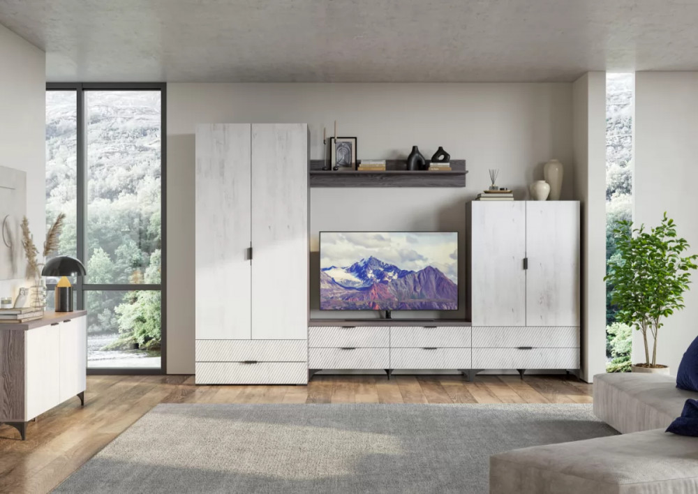 Новые современные цвета: черный ясень - это глубокий серый, легкий и одновременно динамичный цвет в сочетании с санторини белым - цвет с древесными линиями, создающими гармоничный контраст, наполняя пространство воздухом и природной энергией. Визуальная легкость, эстетика графики, элегантная окантовка с четкими формами, баланс теплых и холодных оттенков легли в основу дизайна новых модулей. Комоды и тумбы укомплектованы направляющими полного выдвижения. Строгая лаконичная ручка черного цвета. Крышки 32 мм.