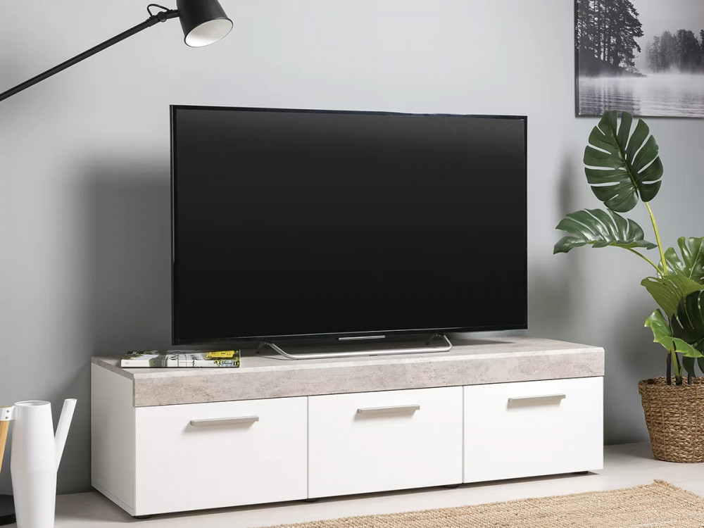 Тумба под ТВ Петра 13.281 будет отличным дополнением интерьера любой комнаты. Изделие поможет разместить телевизор для более комфортного просмотра новостей, сериалов и различных телепередач. Три вместительных выдвижных ящика пригодятся для хранения большого количества различных вещей и предметов. Шершавый и акцентный каменный декор создаёт чёткий контраст с мягкими белыми фасадами, окутанными плёнкой софт-тач.