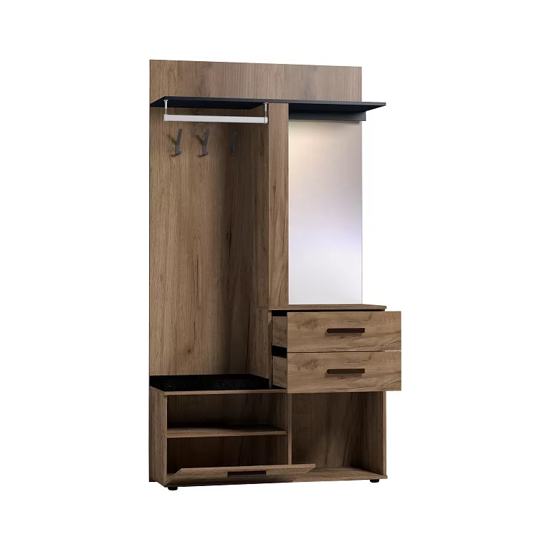 Комбинированный модуль Nature 70 Шкаф МЦН можно расположить в прихожей в составе шкафной группы или автономно. В небольшом по габаритам модуле сочетается всё необходимое: открытая вешалка, тумба для обуви, полка для головных уборов, выдвижные ящики, зеркало с подсветкой. Встроенная светодиодная подсветка включается при помощи аккуратного кнопочного выключателя. Выдвижные ящики оснащены шариковыми направляющими. Откидной фасад обувной тумбы дополнительно фиксируется при закрывании магнитной защелкой. В комплектацию входит мягкая подушка из черной экокожи с золотой строчкой. Собрать шкаф МЦН можно как на правую, так и на левую сторону.
