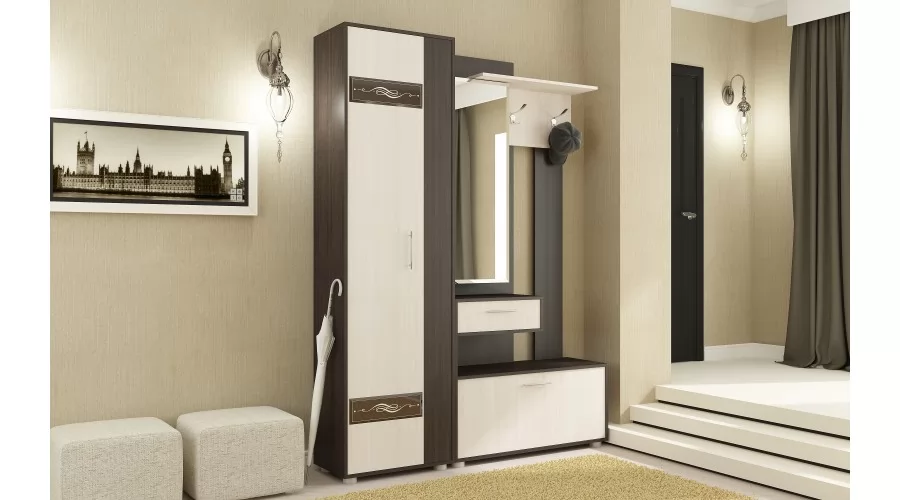 Секция с зеркалом (зеркало имеет широкий фацет по периметру) может быть собрана как на левую, так и на правую сторону. Фасады шкафов универсальные и могут быть установлены в зеркальном отображении, что позволяет открывать шкаф как на левую, так и на правую сторону. В наполнение шкафа-пенала входит выдвижная штанга и четыре полки. В качестве дополнительного декора фасадов использовано декоративное стекло с широким фацетом и рисунком, окрашенное по специальной технологии, усиливающее глубину восприятия. Створка обувницы имеет два газ лифта, выдвижной ящик на роликовых направляющих, применены регулируемые по высоте опоры, высокопрочные крючки. Задние стенки и дно ящика выполнены из ламинированного и облагороженного ЛДВП в цвет корпуса.