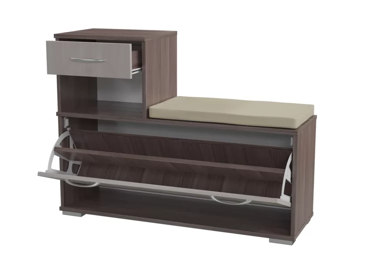 Прихожая "Лира" - компактная мебель для небольшой квартиры. Вешалка оборудована шестью крючками для одежды, антресольной полкой для головных уборов и большим зеркалом. Тумба оборудована выдвижным ящиком, обувницей, и мягким элементом для сидения.