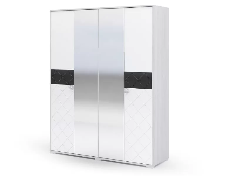 Четырехстворчатый шкаф ШК 024 входит в модульный ряд спальни Сальма. Шкаф Сальма современный и оригинальный, благодаря необычным фасадам, выполненным в декоре Белый глянец с графическим узором линейки и вставкой из стекла черного цвета-лакобель. Шкаф ШК 024 оснащен 2-мя встроенным зеркалами на всю длину фасада, и отделениями внутри: полочками и штангой для вешалок.