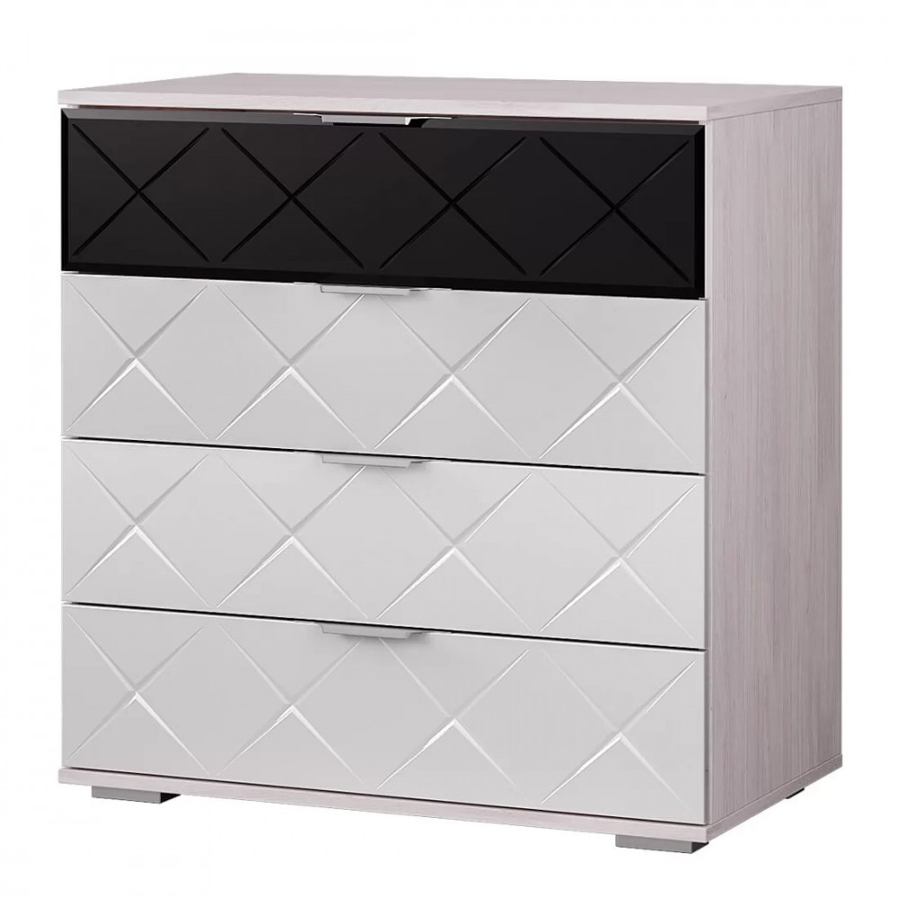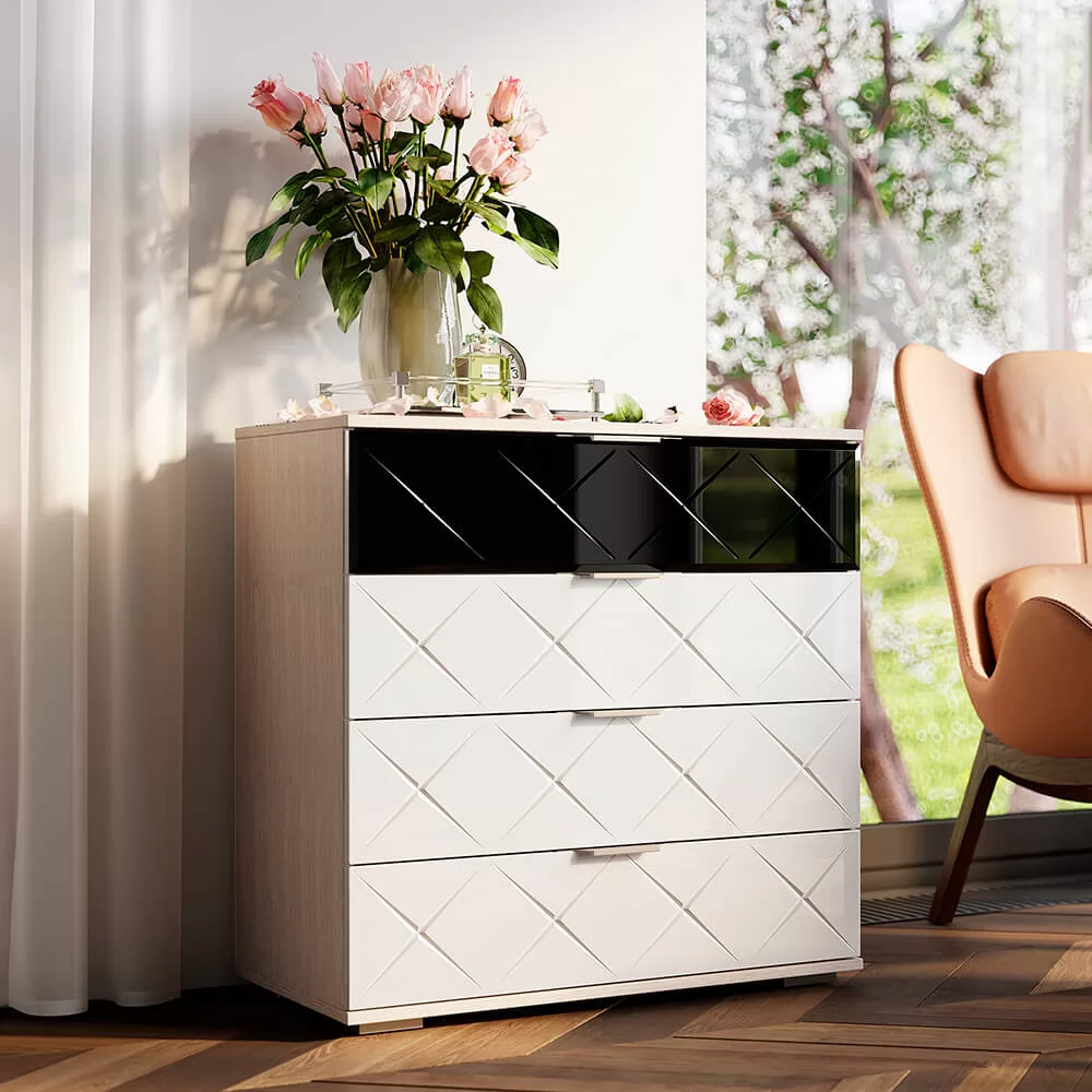 Комод Кимберли выделяется своим необычным дизайном, а именно черным фасадом верхнего ящика и стильными эргономичными ручками.