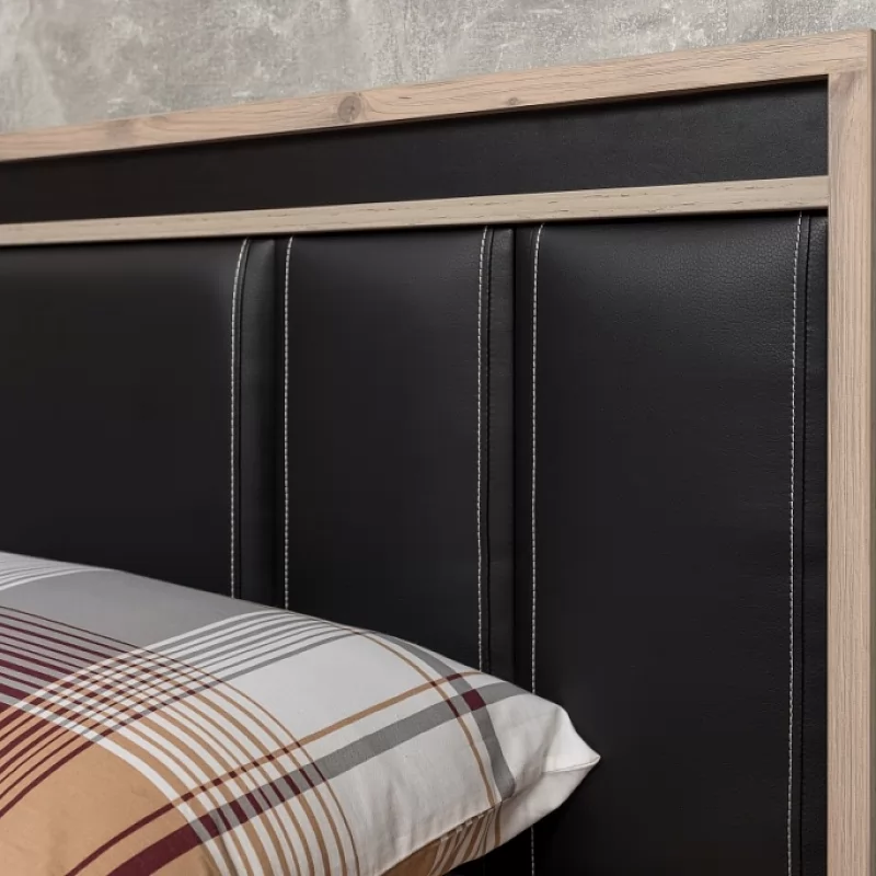 Двуспальная кровать NATURE 306 Кровать Люкс (1800) станет стильным дополнением для вашей спальни. Спокойный приятный древесный декор поможет создать атмосферу настоящего уюта и комфорта в комнате. А контрастные черные вставки из ЛДСП и декоративные золотые нити на черной экокоже сделают изголовье кровати интересным и современным. Экокожа очень легко чистится и не выгорает под воздействием солнечных лучей.